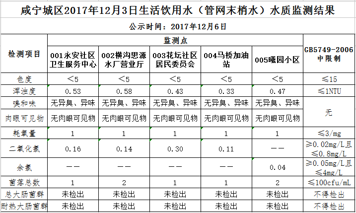 2017年12月6日咸宁城区生活饮用水监测结果公示