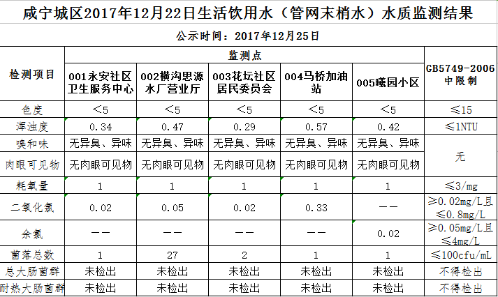 2017年12月25日咸宁城区生活饮用水监测结果公示