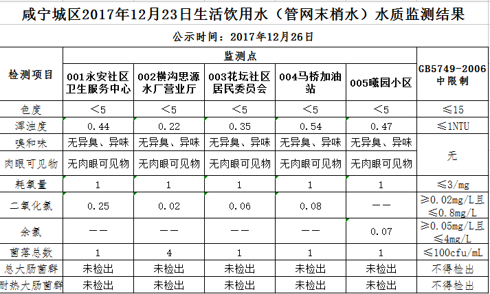 2017年12月26日咸宁城区生活饮用水监测结果公示