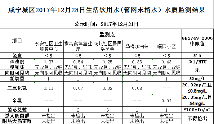 2017年12月31日咸宁城区生活饮用水监测结果公示