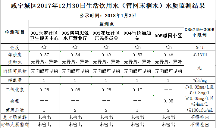 2018年1月2日咸宁城区生活饮用水监测结果公示