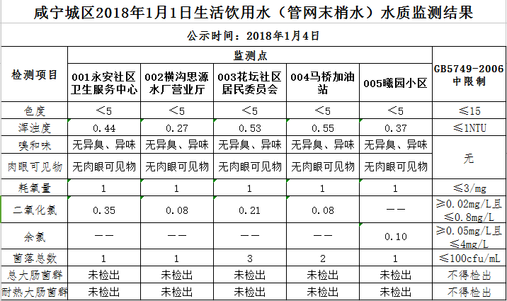 2018年1月4日咸宁城区生活饮用水监测结果公示