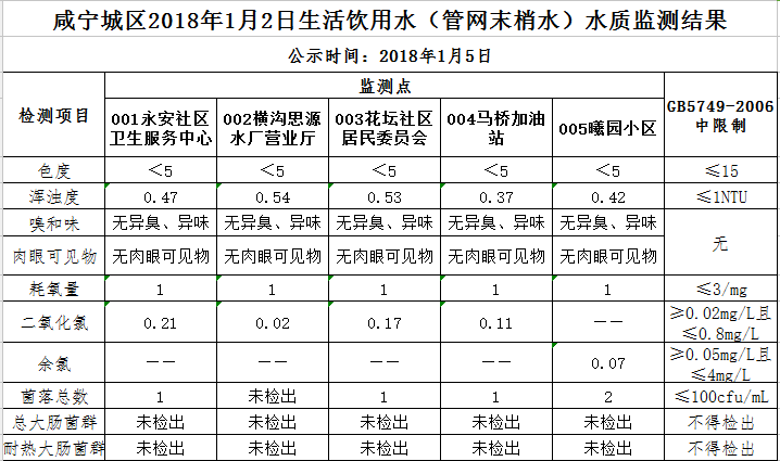 2018年1月5日咸宁城区生活饮用水监测结果公示