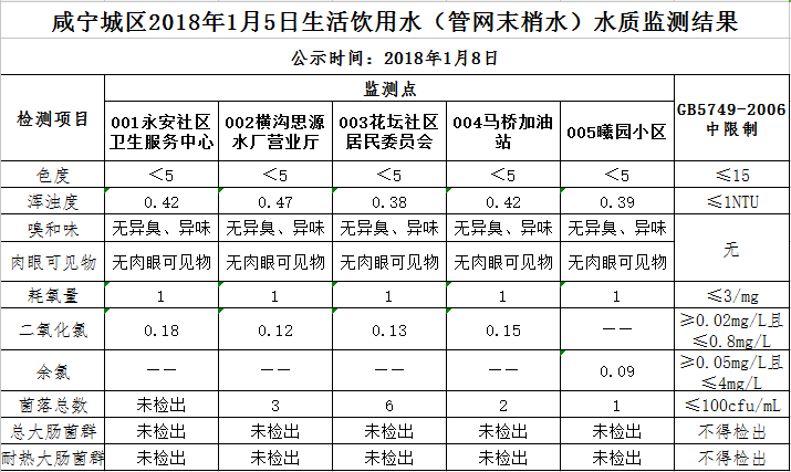 2018年1月8日咸宁城区生活饮用水监测结果公示