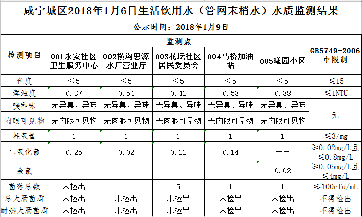 2018年1月10日咸宁城区生活饮用水监测结果公示