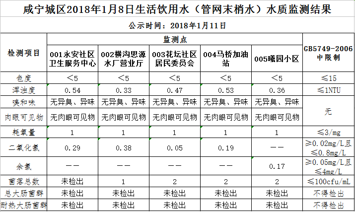 2018年1月11日咸宁城区生活饮用水监测结果公示