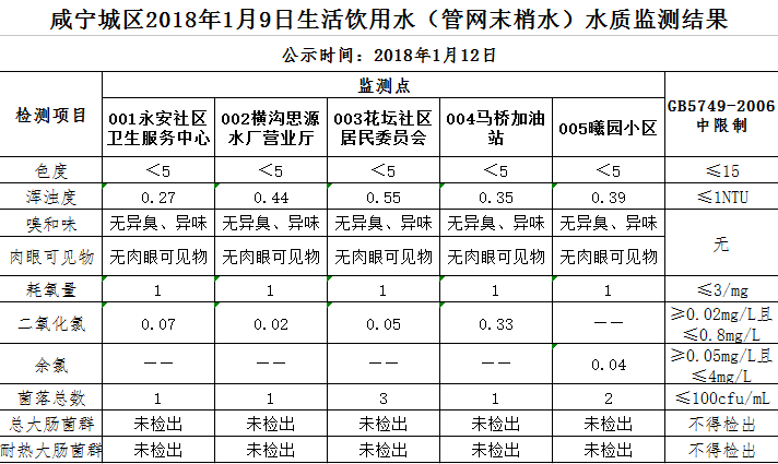 2018年1月12日咸宁城区生活饮用水监测结果公示