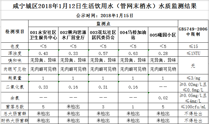 2018年1月15日咸宁城区生活饮用水监测结果公示