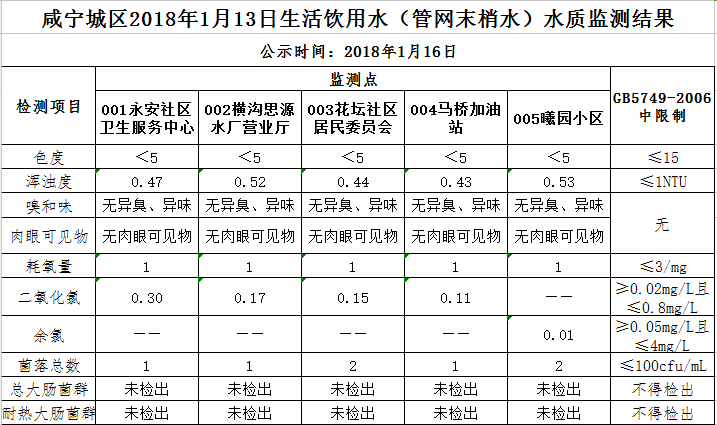 2018年1月16日咸宁城区生活饮用水监测结果公示