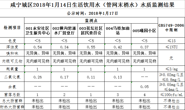 2018年1月17日咸宁城区生活饮用水监测结果公示