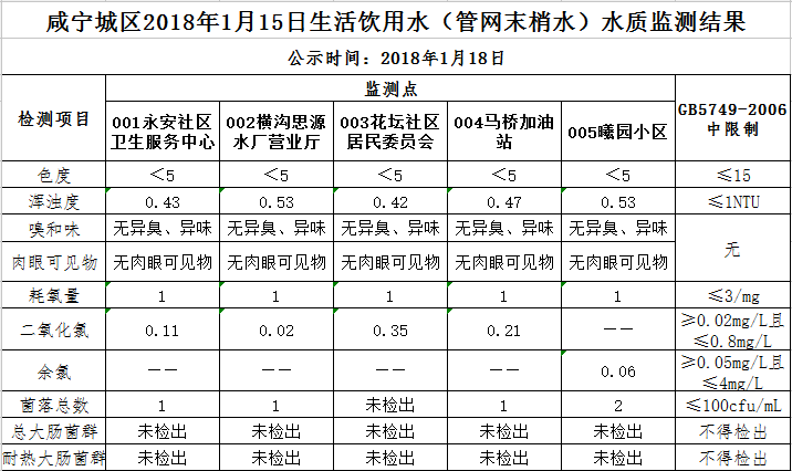 2018年1月18日咸宁城区生活饮用水监测结果公示