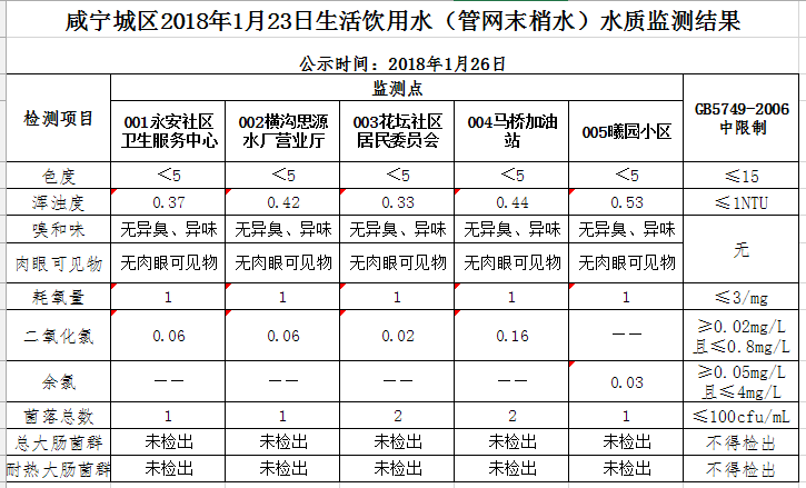 2018年1月26日咸宁城区生活饮用水监测结果公示