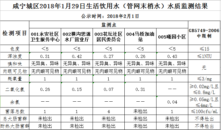 2018年2月1日咸宁城区生活饮用水监测结果公示