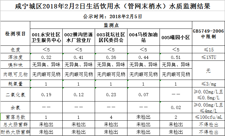 2018年2月5日咸宁城区生活饮用水监测结果公示