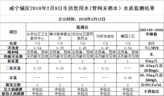 2018年2月11日咸宁城区生活饮用水监测结果公示