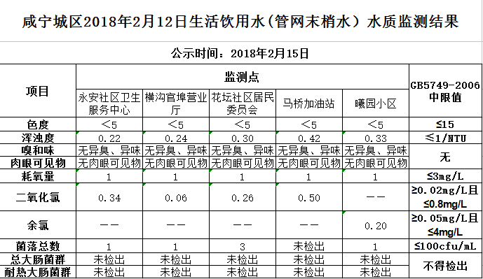 2018年2月15日咸宁城区生活饮用水监测结果公示