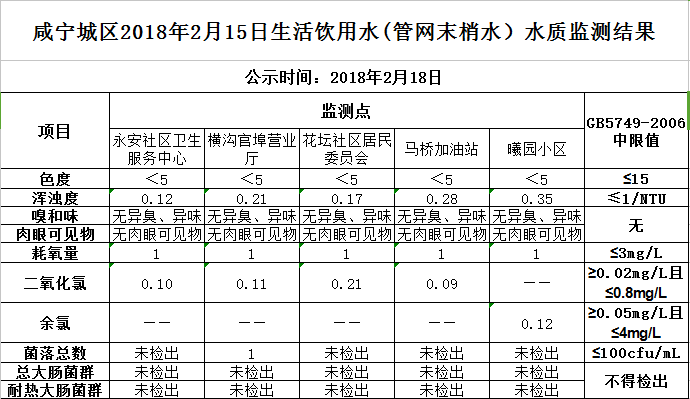2018年2月18日咸宁城区生活饮用水监测结果公示