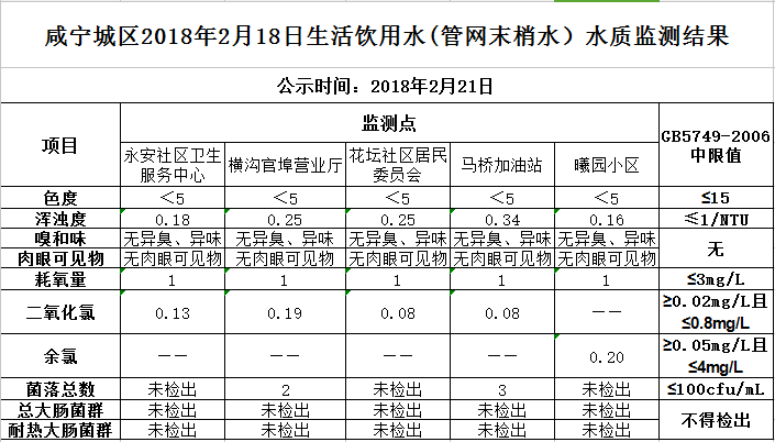 2018年2月21日咸宁城区生活饮用水监测结果公示