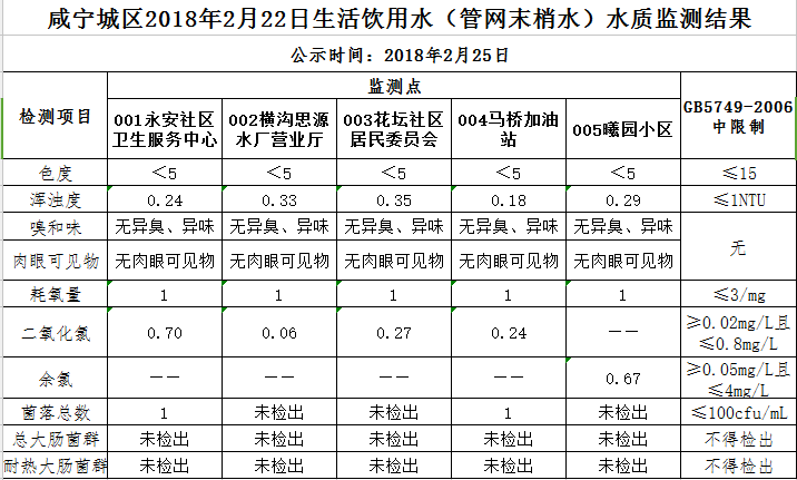 2018年2月25日咸宁城区生活饮用水监测结果公示