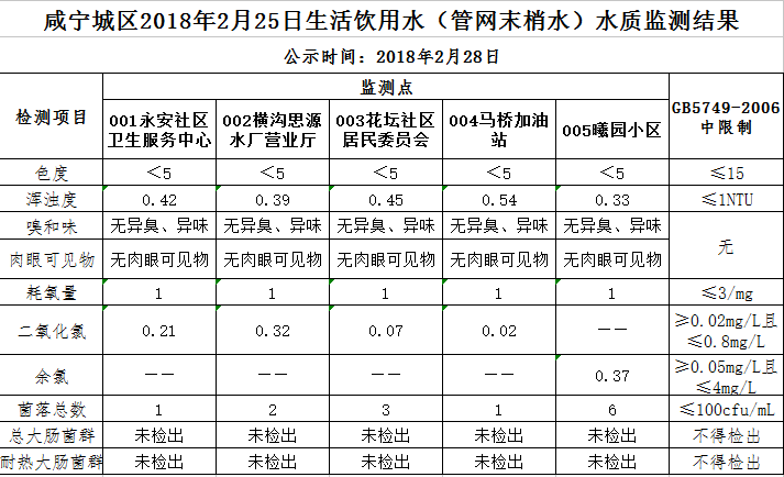2018年2月28日咸宁城区生活饮用水监测结果公示