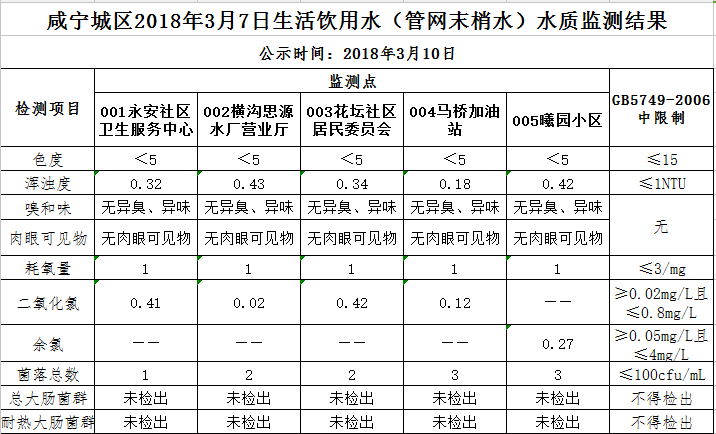 2018年3月10日咸宁城区生活饮用水监测结果公示