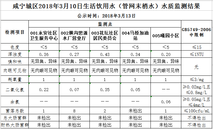 2018年3月12日咸宁城区生活饮用水监测结果公示
