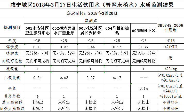 2018年3月20日咸宁城区生活饮用水监测结果公示