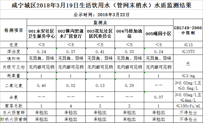 2018年3月22日咸宁城区生活饮用水监测结果公示