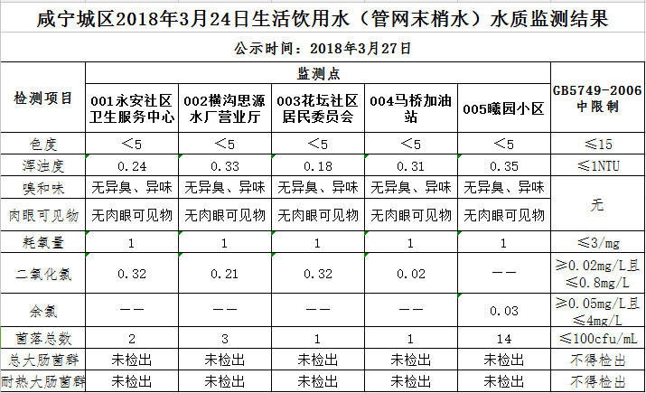 2018年3月27日咸宁城区生活饮用水监测结果公示
