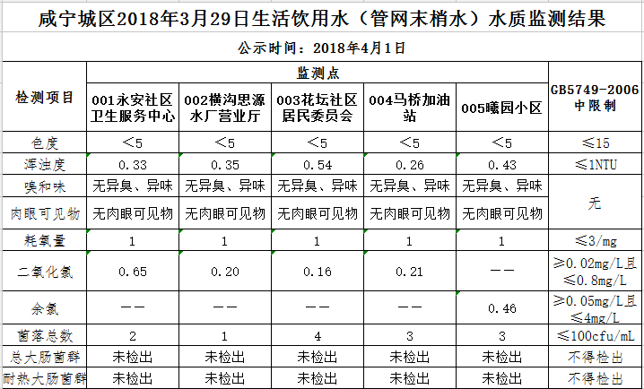 2018年4月1日咸宁城区生活饮用水监测结果公示
