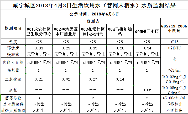 2018年4月6日咸宁城区生活饮用水监测结果公示