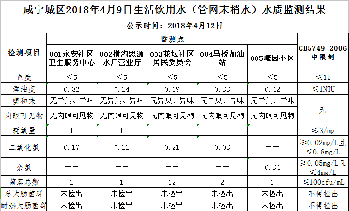 2018年4月12日咸宁城区生活饮用水监测结果公示