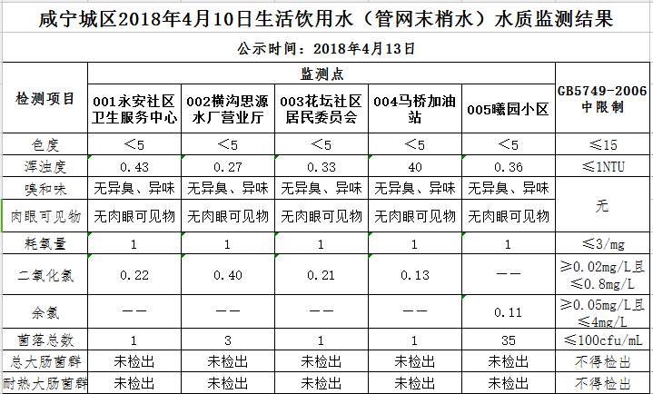 2018年4月13日咸宁城区生活饮用水监测结果公示