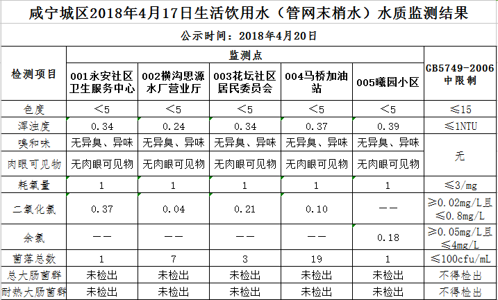 2018年4月20日咸宁城区生活饮用水监测结果公示
