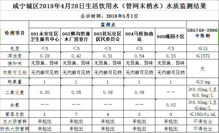 2018年5月1日咸宁城区生活饮用水监测结果公示