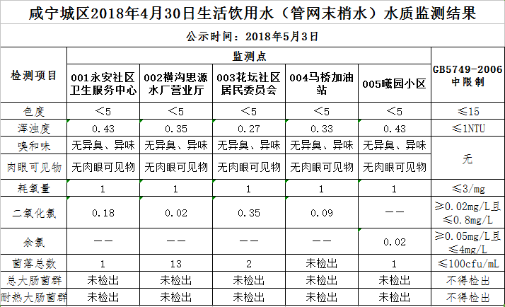 2018年5月3日咸宁城区生活饮用水监测结果公示