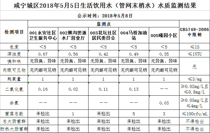 2018年5月8日咸宁城区生活饮用水监测结果公示