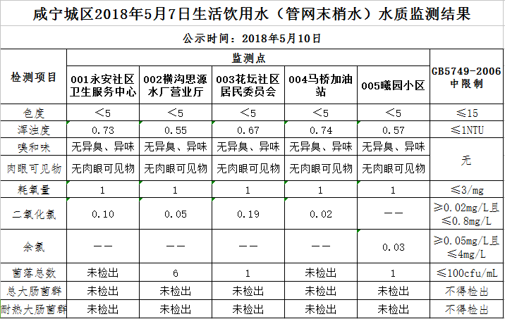 2018年5月10日咸宁城区生活饮用水监测结果公示