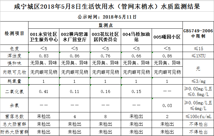 2018年5月11日咸宁城区生活饮用水监测结果公示