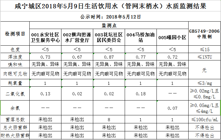 2018年5月12日咸宁城区生活饮用水监测结果公示