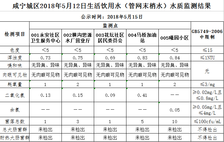 2018年5月15日咸宁城区生活饮用水监测结果公示
