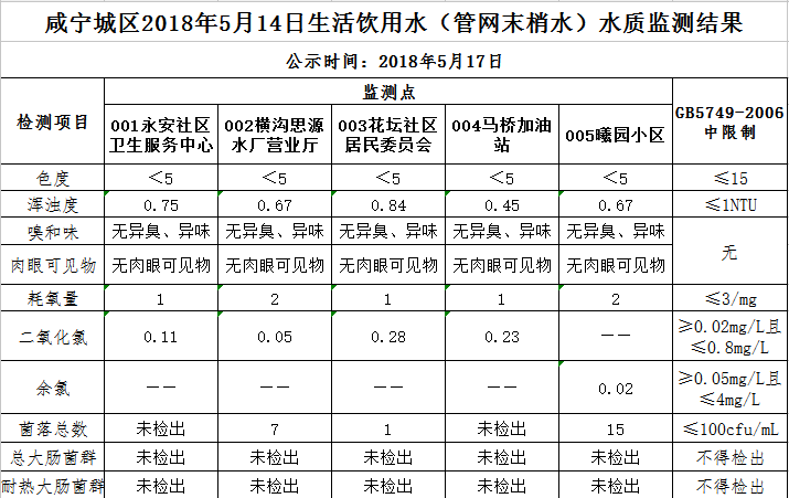 2018年5月17日咸宁城区生活饮用水监测结果公示