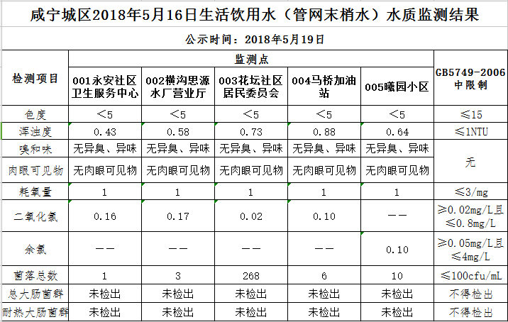 2018年5月18日咸宁城区生活饮用水监测结果公示