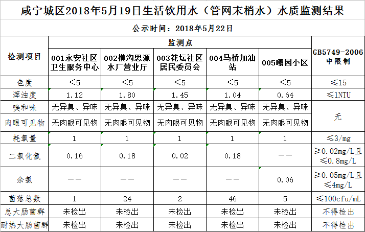 2018年5月22日咸宁城区生活饮用水监测结果公示