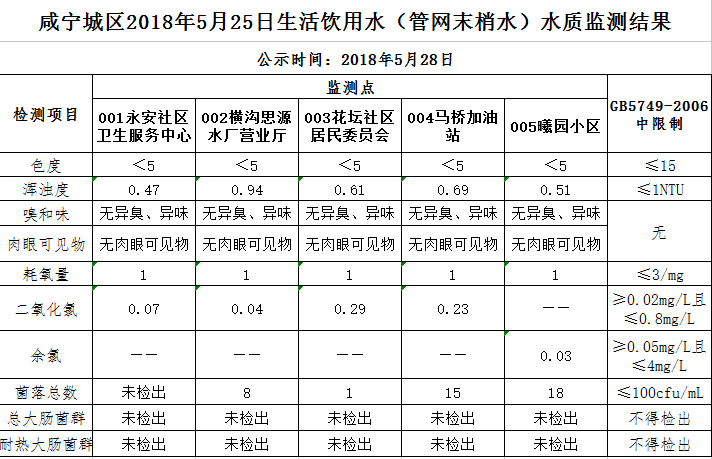 2018年5月28日咸宁城区生活饮用水监测结果公示