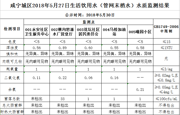 2018年5月30日咸宁城区生活饮用水监测结果公示