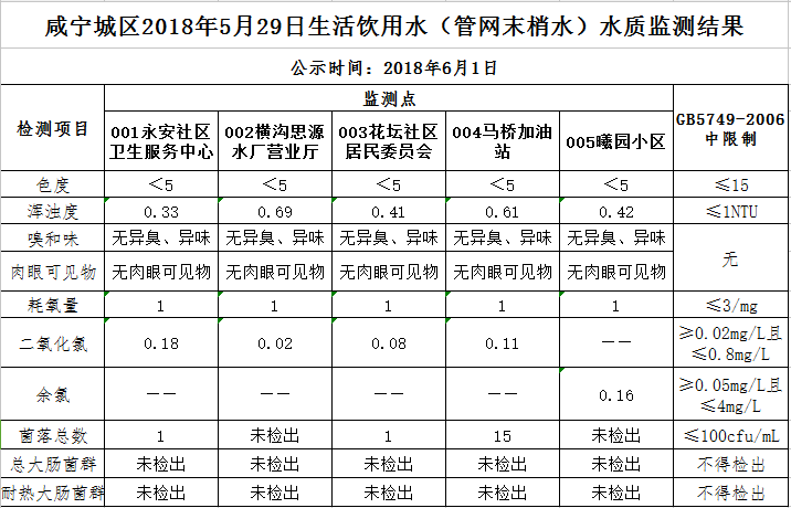 2018年5月31日咸宁城区生活饮用水监测结果公示