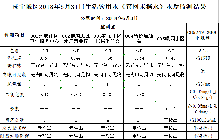 2018年6月3日咸宁城区生活饮用水监测结果公示