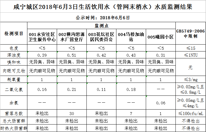 2018年6月6日咸宁城区生活饮用水监测结果公示