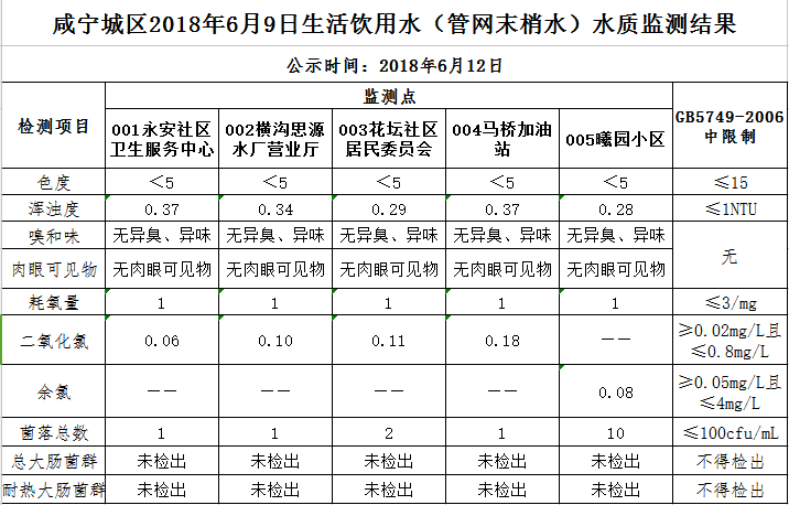 2018年6月12日咸宁城区生活饮用水监测结果公示
